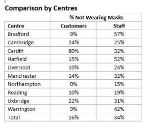 Storecheckers sent mystery shoppers to 130 stores in 10 retail centres across England and Wales, including Northampton. They monitored the proportion of people wearing masks and then assessed how this impacted on their perception of COVID care and security and their willingness to return to each store they had visited.