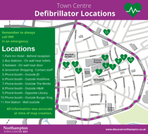 In light of recent events – we have compiled a list of defibrillators located in the Town Centre. These pieces of equipment are vital in saving lives. If you know of any locations we have missed from the map please email info@northamptonbid.co.uk