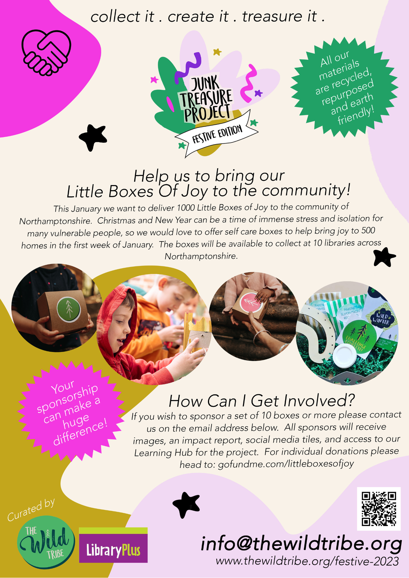 We are asking people to donate a minimum of Ł5 which will pay for the materials and printing elements for 1 Little Box of Joy. Every sponsor will be given social media tiles and a final impact report when the project is finished! We will also be asking local organisations to make larger donations to the project – please keep your eye on The Wild Tribe’s socials to see updates!