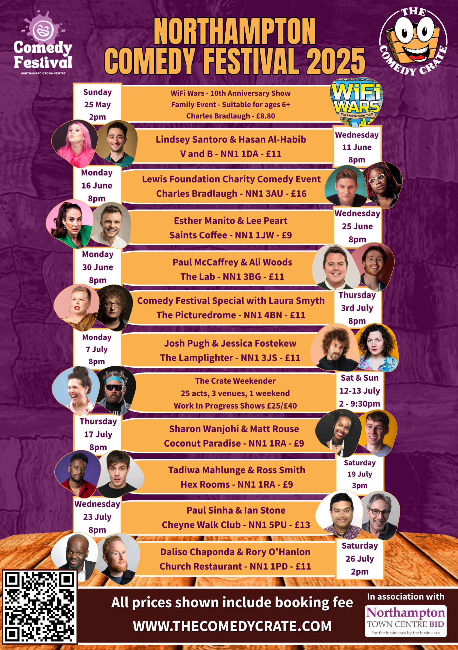 The festival, which takes place between Sunday, 25 May and Saturday, 26 July, has been organised by locally based promoters The Comedy Crate with support from Northampton Town Centre Business Improvement District (BID).