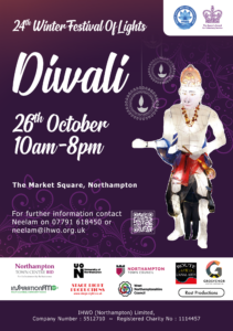 This years is the 25th Anniversary of The Diwali Winter Festival of Lights in Northampton, organised by the Indian Hindu Welfare Organisation Northampton, and supported by Northampton Town Council, West Northamptonshire Council, Northampton Town Centre BID, Inspiration Arts, Rost Productions Ltd, Inspiration FM, University of Northampton, Northampton College and Grosvenor Shopping Centre. The event is supported using public funding by the National Lottery through Arts Council England.