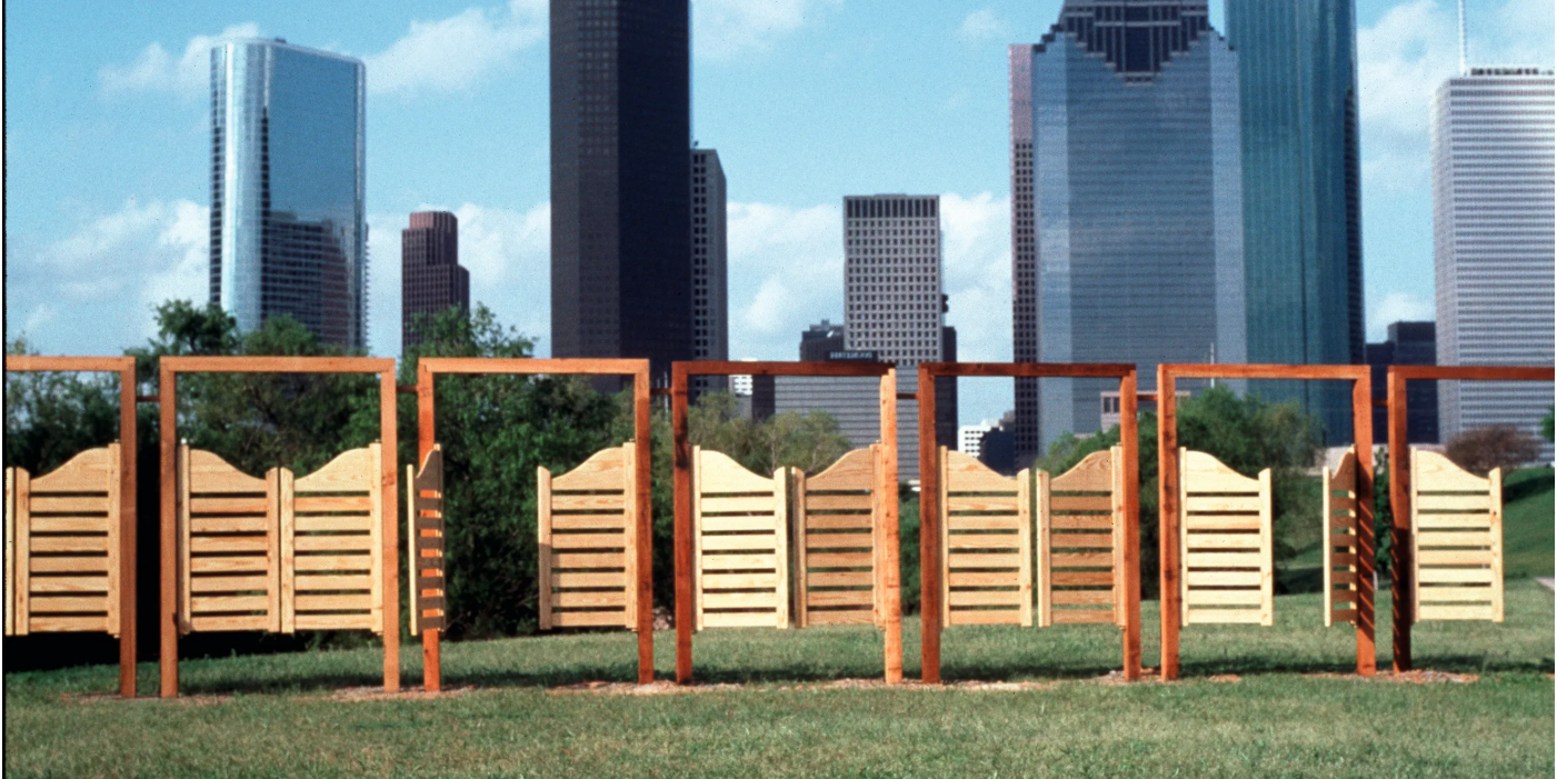 Exhibited publicly for the first time since its original installation, Bar Doors (1991) captures architectural thresholds, foregrounding moments of passage between spaces. The photographic documentation of Finn-Kelcey’s site-specific installation—seven saloon-style doors installed in a Houston city park—invites viewers to reconsider familiar architectural features as markers of access and permission.