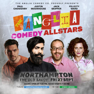The Anglia Comedy Allstars return at The Old Savoy – Home of The Deco Theatre, Northampton this September, with another fantastic line-up featuring the hilarious Paul Chowdhry, Justin Moorhouse, Felicity Ward & Jack Skipper. Paul Chowdhry is an acclaimed stand-up comedian, celebrated for his wit and versatility. Renowned as the most successful British Indian stand-up comedian in history, Paul’s career is marked by numerous accolades and groundbreaking achievements, including selling out the 10,000 capacity Wembley Arena.