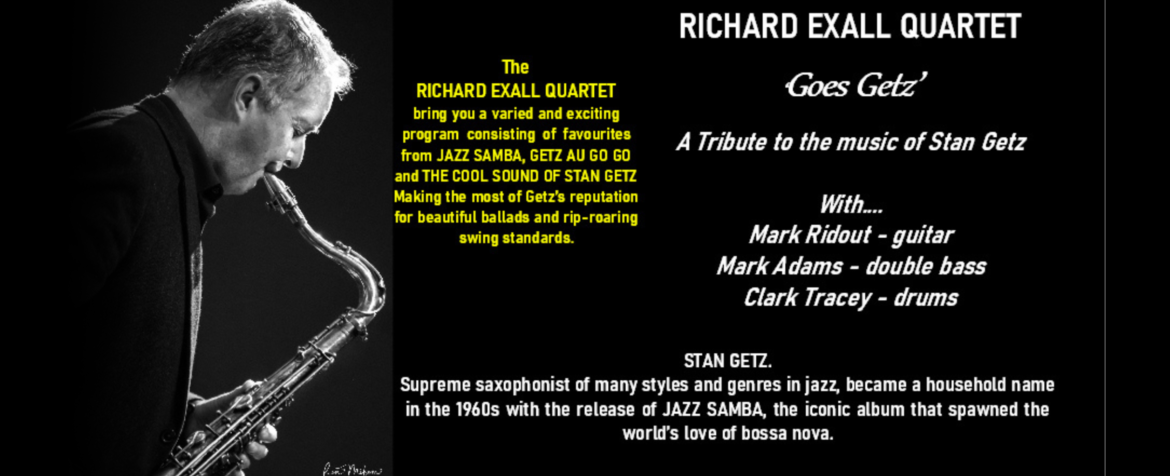 Richard Exall Quartet presents Goes Getz: A Tribute to the music of Stan Getz Mike Ridout – Guitar Mark Adams – Double Bass Clark Tracey – Drums The Richard Exall Quartet bring you a varied and exciting programme consisting of favourites from Jazz Samba, Getz Au Go Go and The Cool Sound Of Stan Getz. Making the most of Getz’s reputation for beautiful ballads and rip-roaring swing standards.