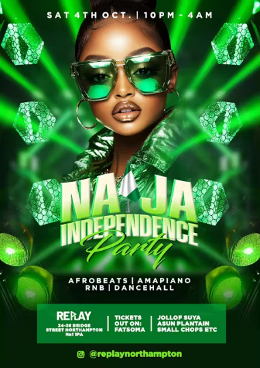 Nigeria Independence Party @ REPLAY Nigerian Independence Party @ Replay Saturday 4th October | 10PM – 4AM Replay Northampton (former Revolutions/Playhouse), Bridge Street (opposite NB's) ? The Vibes We’re turning Replay ALL the way up for Naija Independence! DJs + live performers bringing you the hottest sounds all night: Afrobeats • Dancehall • Amapiano • Bashment • R&B • Club Classics. Full line-up dropping soon ? ? The Flavours What’s a Naija celebration without food? Expect the REAL deal: ? Jollof Rice ? Suya ? Asun ? Plantain & more! ? Ballers & Divas Step out in style, link up with the tribe, and party ‘til the lights come on. ?? Tickets will FLY — grab yours now and don’t get left behind!