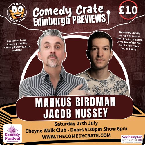 July 27, 2024 @ 6:00 pm - 8:30 pm Comedy Crate – Markus Birdman & Jacob Nussey Cheyne Walk Club 2 Cheyne Walk, northampton