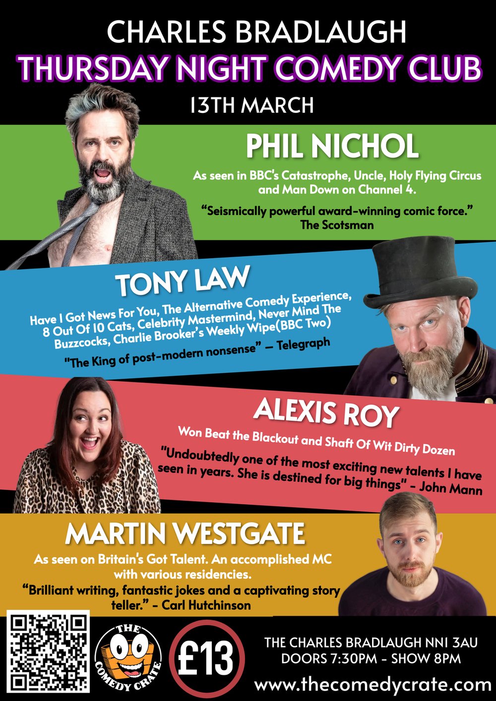 Venue: The Charles Bradlaugh 1, Earl Street, NN1 3AU. Times: Doors 7pm - Show 8pm Featuring: Phil Nichol, Tony Law, Alexis Roy, Martin Westgate Price: £13 NO Booking Fee Line ups are subject to change.