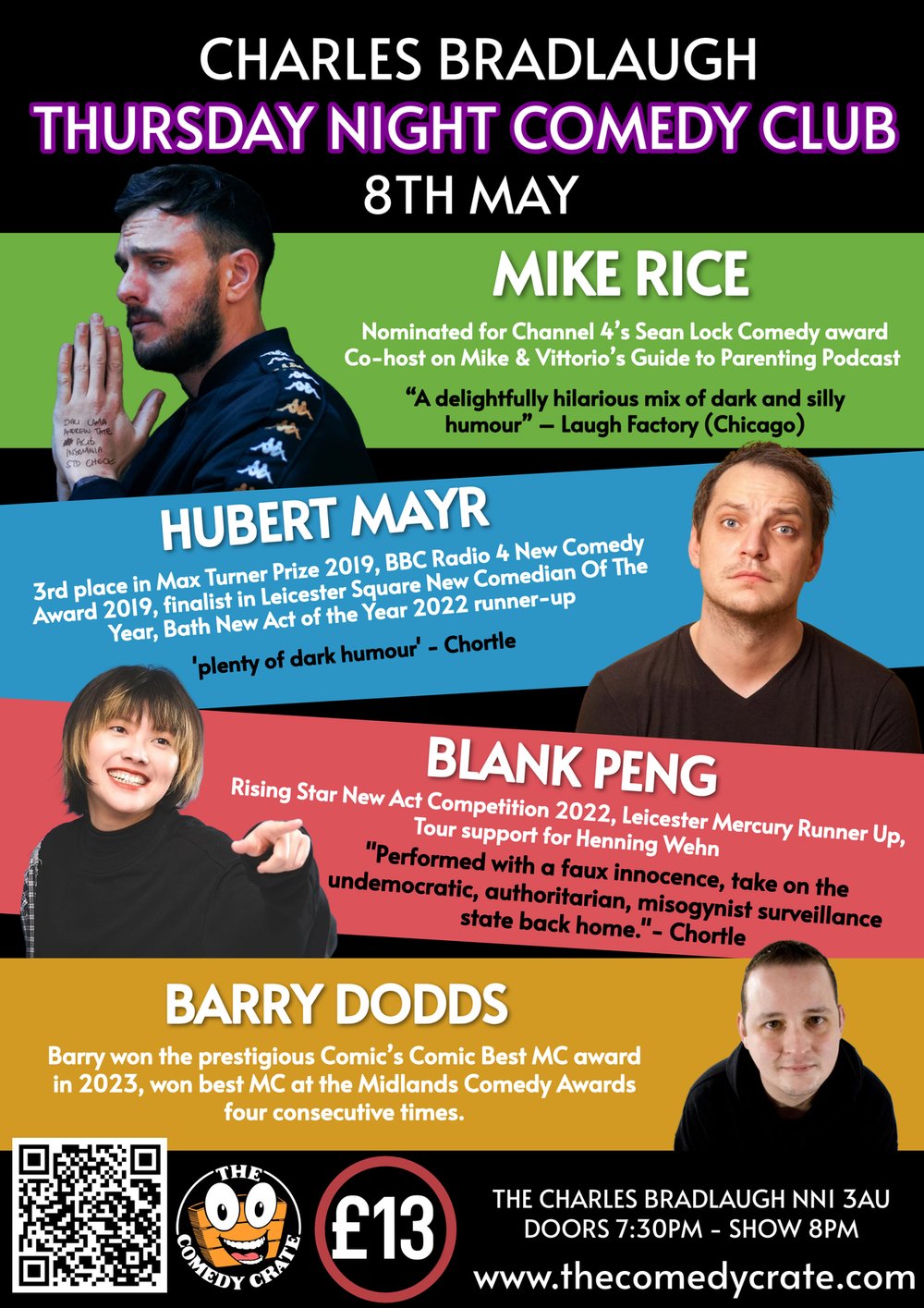 Venue: The Charles Bradlaugh 1, Earl Street, NN1 3AU. Times: Doors 7pm - Show 8pm Featuring: Mike Rice, Hubert Mayr, Blank Peng, Barry Dodds Price: £13 NO Booking Fee Line ups are subject to change.