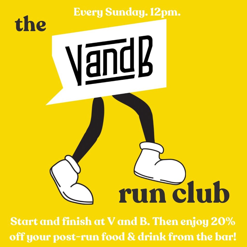 The V and B Run Club. Start and finish at V and B Northampton, then enjoy 20% off your post-run food and drink from the bar. All levels welcome – meet new people and feel better for it! Meet at 12. Every Sunday.
