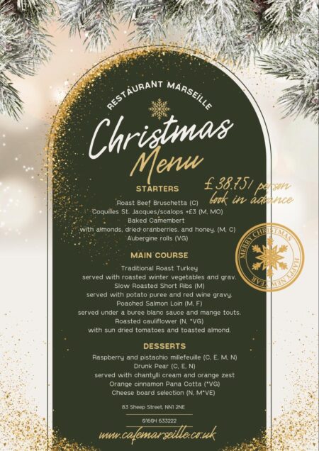 - Cafe Marseille Christmas Menuhttps://www.cafemarseille.co.uk/ Join our mailing list for our weekly what's on guide! JTVCbWM0d3BfZm9ybSUyMGlkJTNEJTIyMTA5MTY3JTIyJTVE You can update your preferences or...