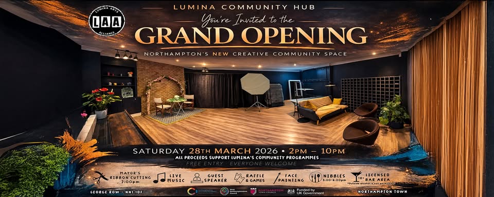 9 George Row 9 George RowSomething special is happening in Northampton… After months of preparation, creativity, and powerful community support, we’re proud to invite you to the Grand Opening of the Lumina Community Hub. On Saturday 28th March, we officially open the doors to a brand new creative space in the heart of Northampton. Not just a venue.A community-powered hub built for creativity, connection, and opportunity.  What this space is aboutA place where you can:• Learn new skills• Explore your creativity• Collaborate with others• Discover opportunities through the arts Our mission:To make creativity accessible, inclusive, and empowering for everyone. Throughout the year, the hub will host workshops, exhibitions, creative sessions, and community events.It will also be available to hire at accessible rates for artists, organisations, and facilitators.  Grand Opening Highlights Mayor’s official ribbon cutting Live music & performances Inspiring guest speaker Raffles & games Face painting for families Nibbles & refreshments Licensed bar Meet the Lumina team & explore the space  Why this mattersEvery drink, raffle ticket, and purchase helps fund future workshops, exhibitions, and creative opportunities across Northampton. You’re not just attending an event.You’re supporting something bigger.This space exists because the community believed in it.Now we open the doors for everyone to experience it.  We’ll also be revealing some very exciting performers...