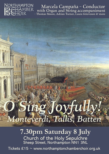 O Sing Joyfully! Saturday 8 July, Holy Sepulchre, Northampton The choir returns to the Church of the Holy Sepulchre, this time to perform the Monteverdi in concert, along with other European music from the period by composers such as Tallis and Batten. Sit back and relax in this superb historic building and listen to the choir along with organ and string accompaniment from Thomas Moore, Adrian Turner and others. Tickets are £15, free for under 19s, available via the link below with an early purchase discount, or on the door: Get Tickets for "O Sing Joyfully!"