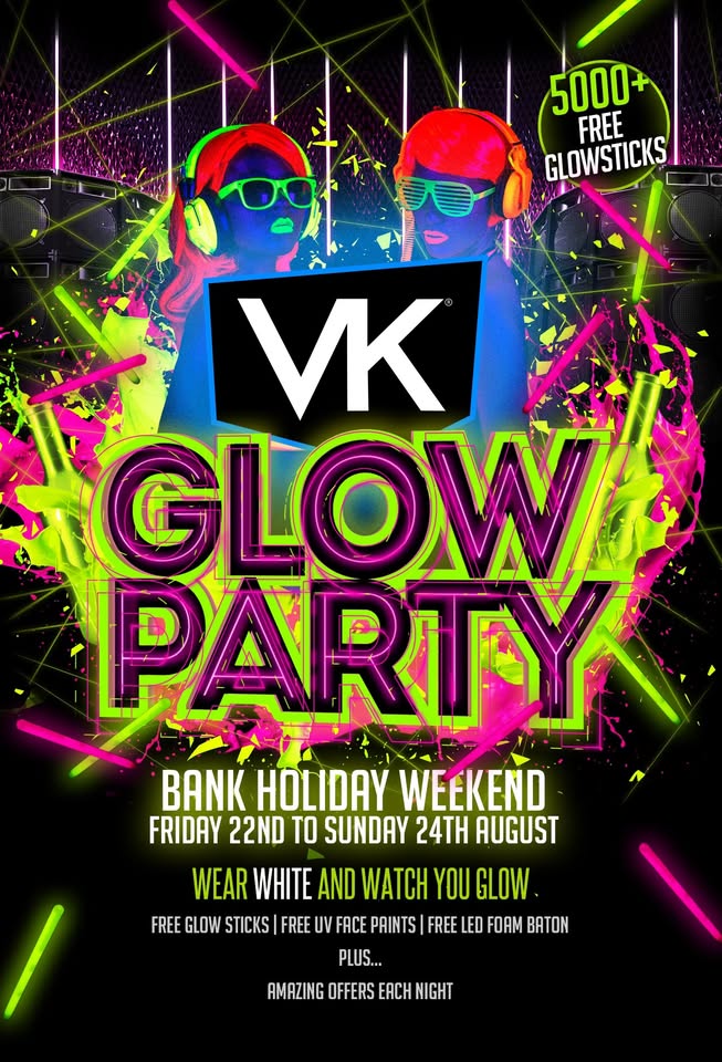 VK GLOW PARTY WEEKEND FREE GIVEAWAYS INCLUDING:GLOW STICKSVK LED FOAM BATONSVK SNAP BANDSUV FACE PAINTS (Sat only) FRIDAYOPEN 22:00-04:00£5 ENTRY ALL NIGHT2 VK's FOR £6 AND MUCH MORE... SATURDAYOPEN 21:00-04:00£7 ENTRY B4 MIDNIGHT, £10 AFTER2-4-1 ON SELECTED DRINKS INC. VK's B4 MIDNIGHT SUNDAYOPEN 22:00-04:00£5 ENTRY ALL NIGHT2-4-1 ON SELECTED DRINKS INC. VK's B4 MIDNIGHT