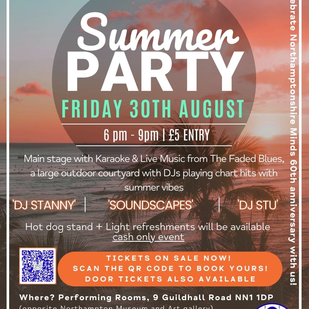 Performing Room in collaboration with Northamptonshire Mind presents THE SUMMER PARTY! The Summer Party will feature 'DJ Stanny', 'DJ Stu' and 'Soundscapes' with a short 'Open Deck' space for anyone who wants to have a go! Genres played will be a mixture of soul, disco, chart, drum & bass and house. The upstairs recording rooms and practice rooms will also be open to the public to try out different instruments. Tickets are £5 and proceeds will support the work of two amazing local charities: Northamptonshire Mind and Performing Room. Location Performing Rooms, NN1 1DP