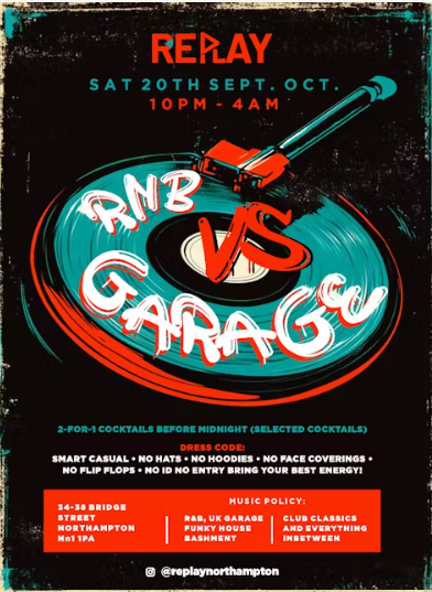 RnB vs Garage @ REPLAY ? R&B vs Garage @ Replay Northampton ?? The ultimate clash of smooth R&B and bumpy Garage with a touch of Bashment and Funky House. Expect a packed dancefloor, throwback classics & pure Replay energy. ? Venue: Replay Northampton – Bridge Street ? Date: Saturday 20th September – Sunday 21st September ? Time: 10PM – 4AM ? Music Policy R&B • UK Garage • Funky House • Bashment • Club Classics • & everything in between! ?? Ticket Info £3 Early Bird – Limited availability £5 Standard – Grab yours before they go More on the Door – Don’t miss out (ticket validity if you want, like £3 before 11pm, £5 before 11:30pm etc.) ? Drinks & Vibes 2-for-1 cocktails before midnight (selected cocktails) VIP & bottle packages available Shots & spirits all night long ? Dress Code Smart casual • Party energy • Bring your crew