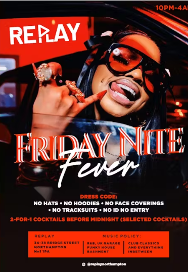 Replay Northampton, Bridge Street Vibes & Extras Cocktails served till midnight Arcade room open till midnight Booths & birthday shout-outs available (DM to book) Music Policy Club Classics • Old School • DnB • RnB • Afrobeats • and everything in between our resident DJs have got you all night. Age: 18+ (Bring physical photo ID) Tickets & Entry Free before midnight — with a free ticket only £3 after midnight — with ticket More on the door (limited capacity, arrive early) Ticket validity is based on arrival time. If you arrive after your ticket window, standard door prices apply. Last entry: 2am Dress Code Smart Casual • No Tracksuits • No Face Coverings Management reserves the right of admission. No refunds for late arrival beyond ticket validity. Grab your ticket now to lock in free entry before 12 — see you on the dance floor!